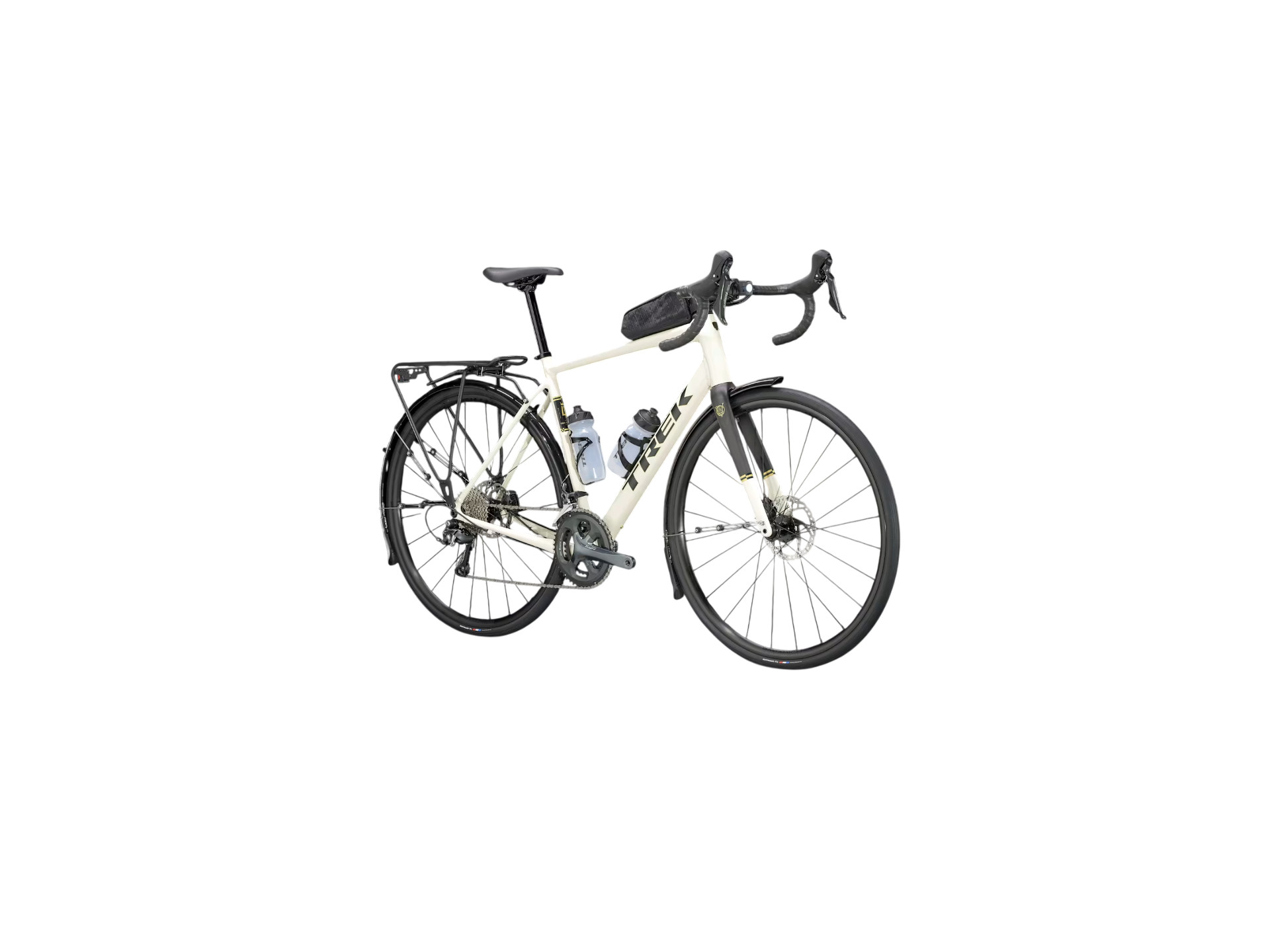 Den är utrustad med en pålitlig Shimano Tiagra 10-växlad drivlina, kolfibergaffel och hydrauliska skivbromsar för säker kontroll i alla väder. Praktiska fästen för skärmar och överrörsväska gör den redo för både vardag och äventyr.