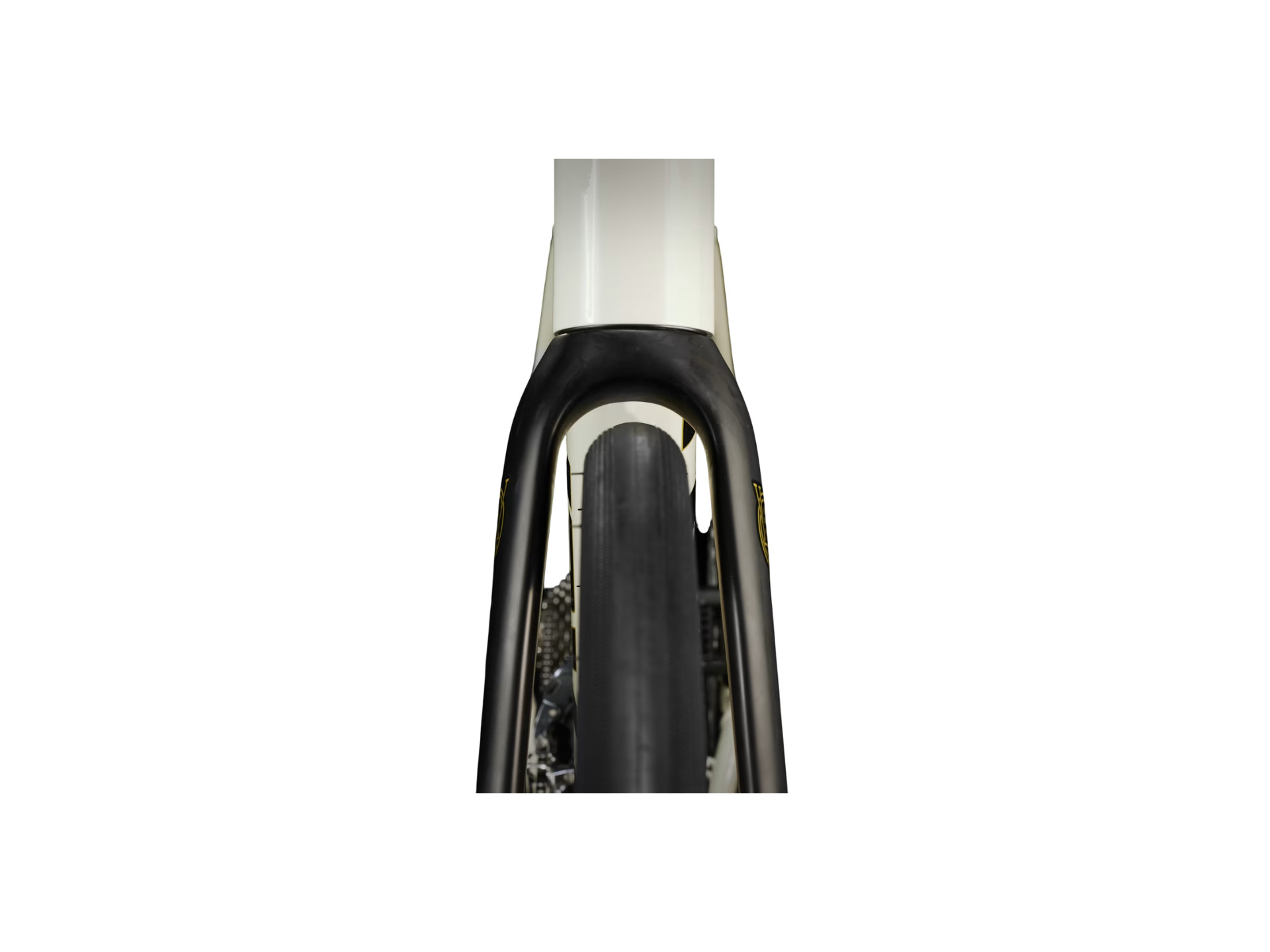 Gaffel: Domane AL carbon, taperad carbon steerer, invändig bromsdragning, skärmfästen, Flat Mount, 12x100 mm genomgående axel