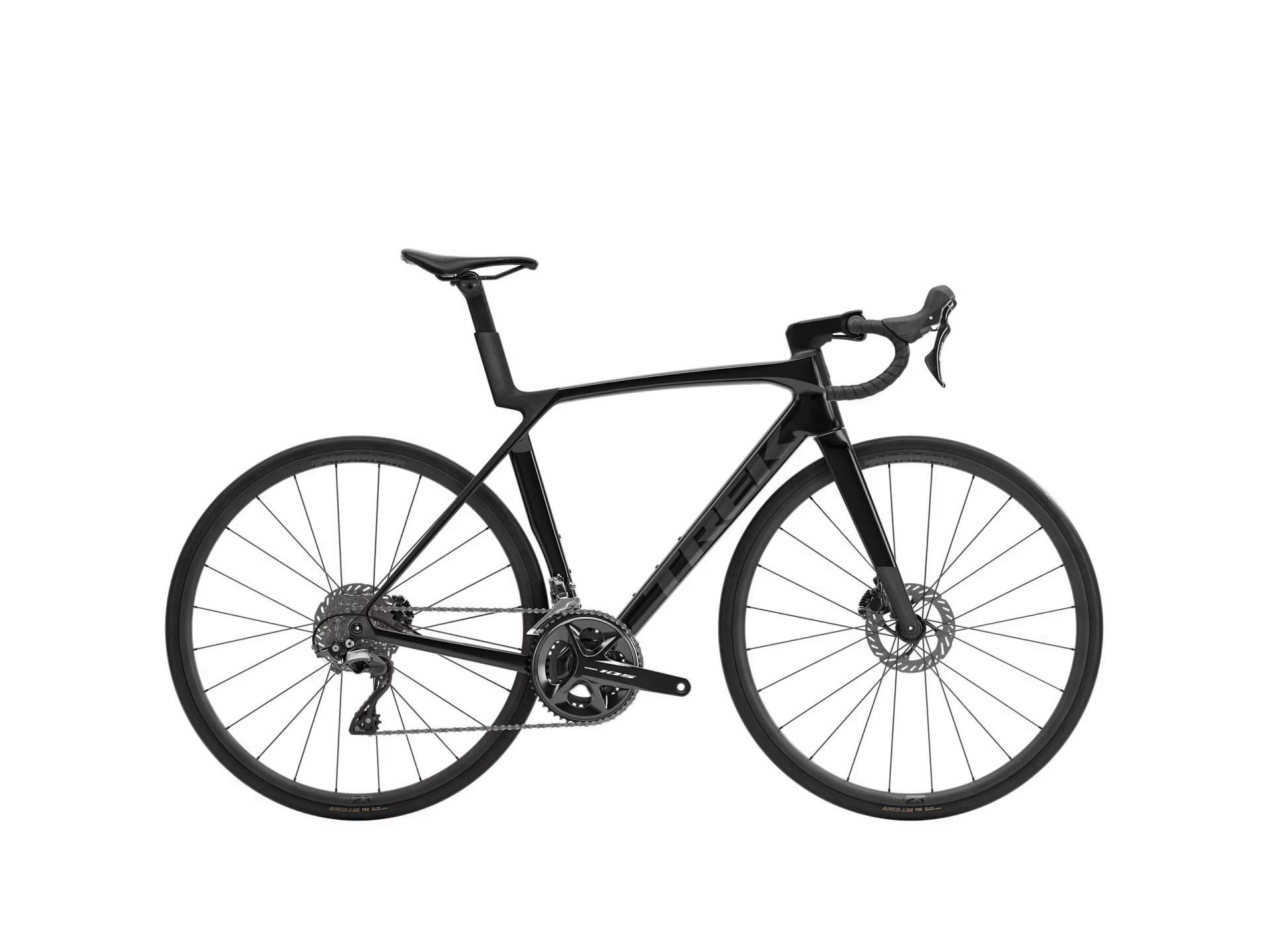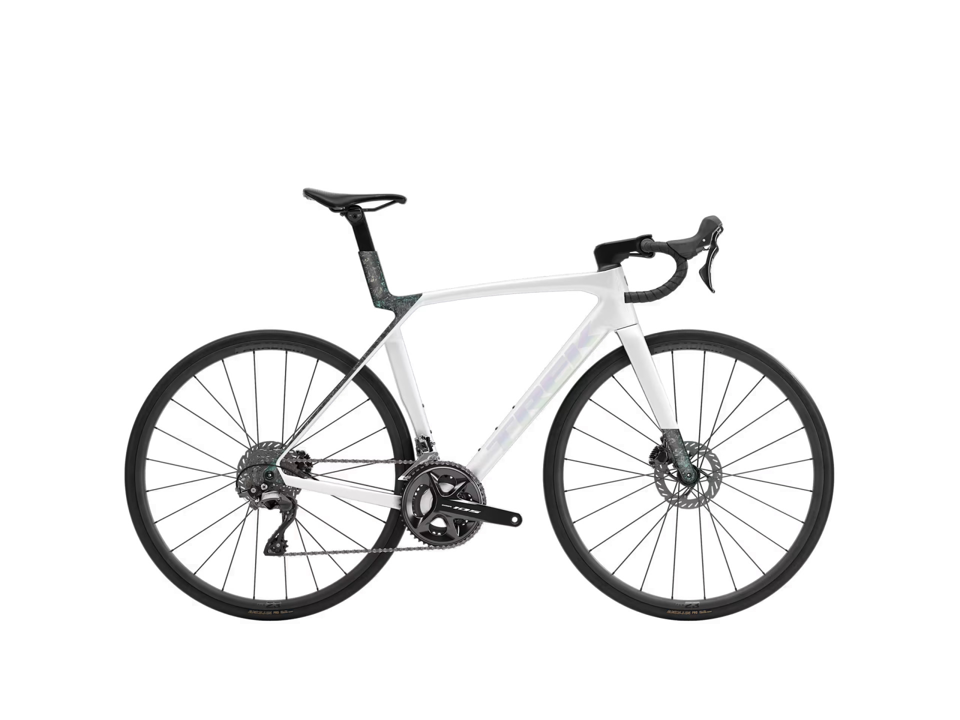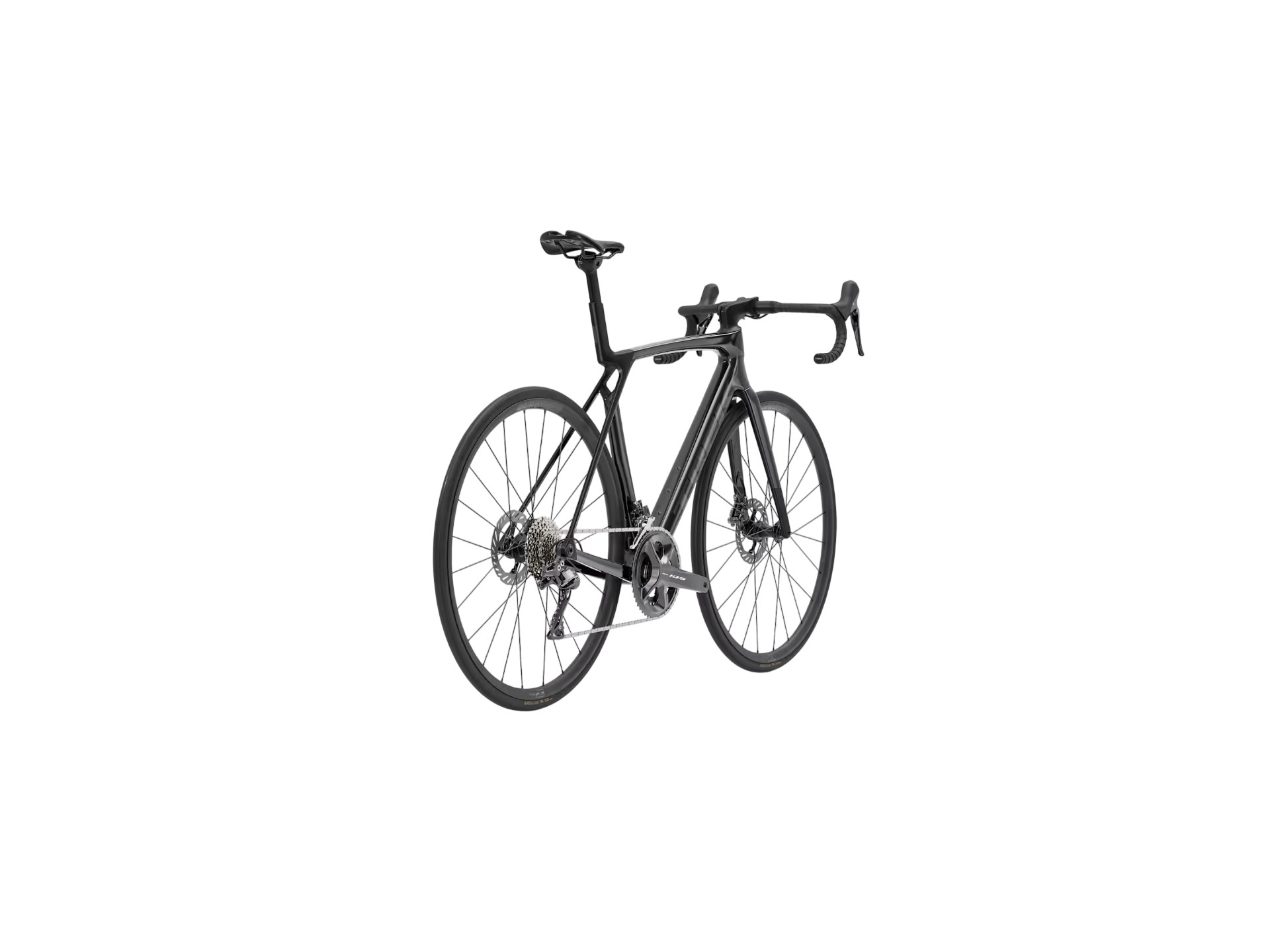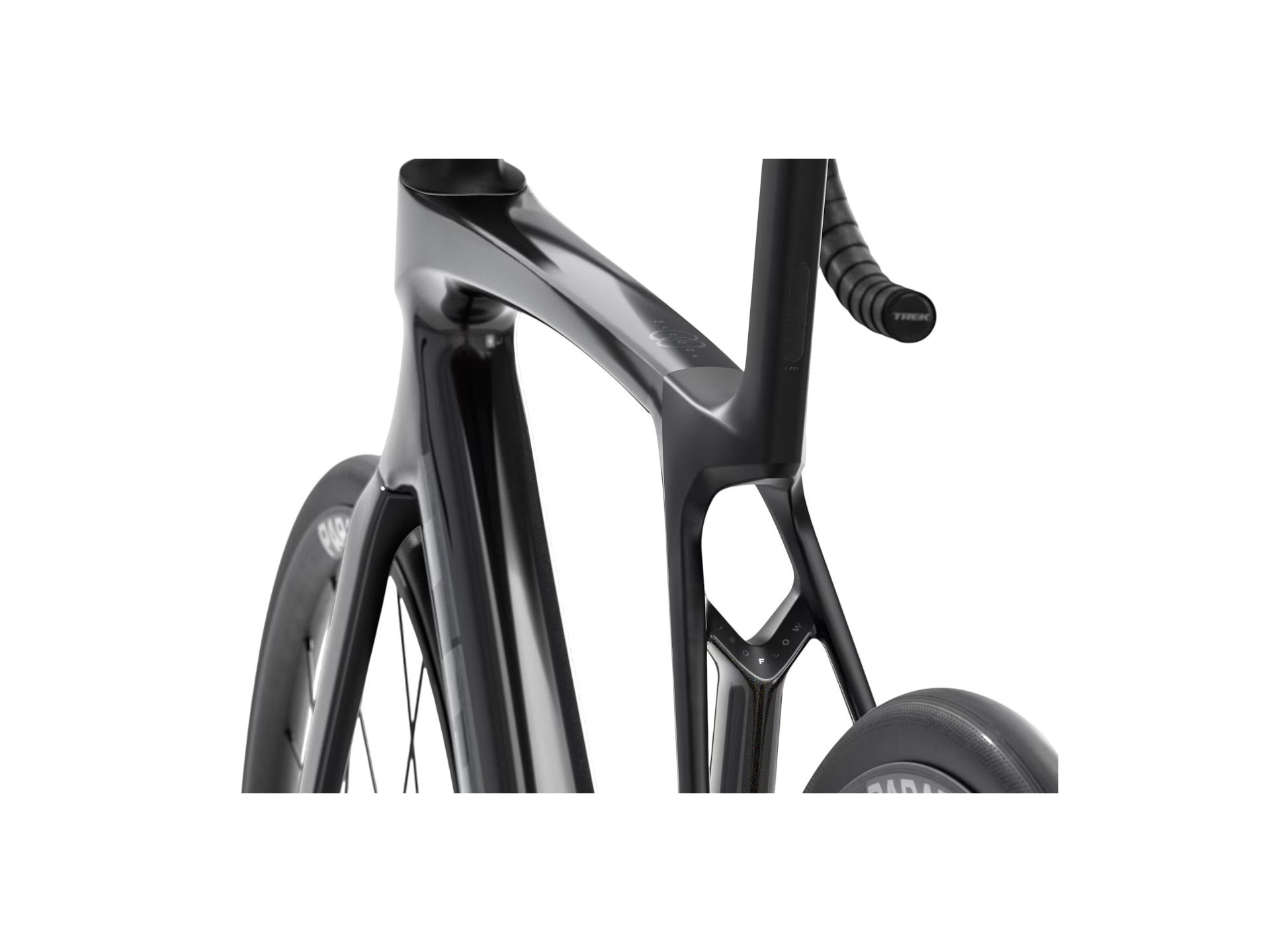 Gaffel: Madone Gen 8 helt i kolfiber, koniskt styrrör i kolfiber, invändig bromsdragning, Flat Mount-skivbroms, 12 x 100 mm avfasad genomgående axel