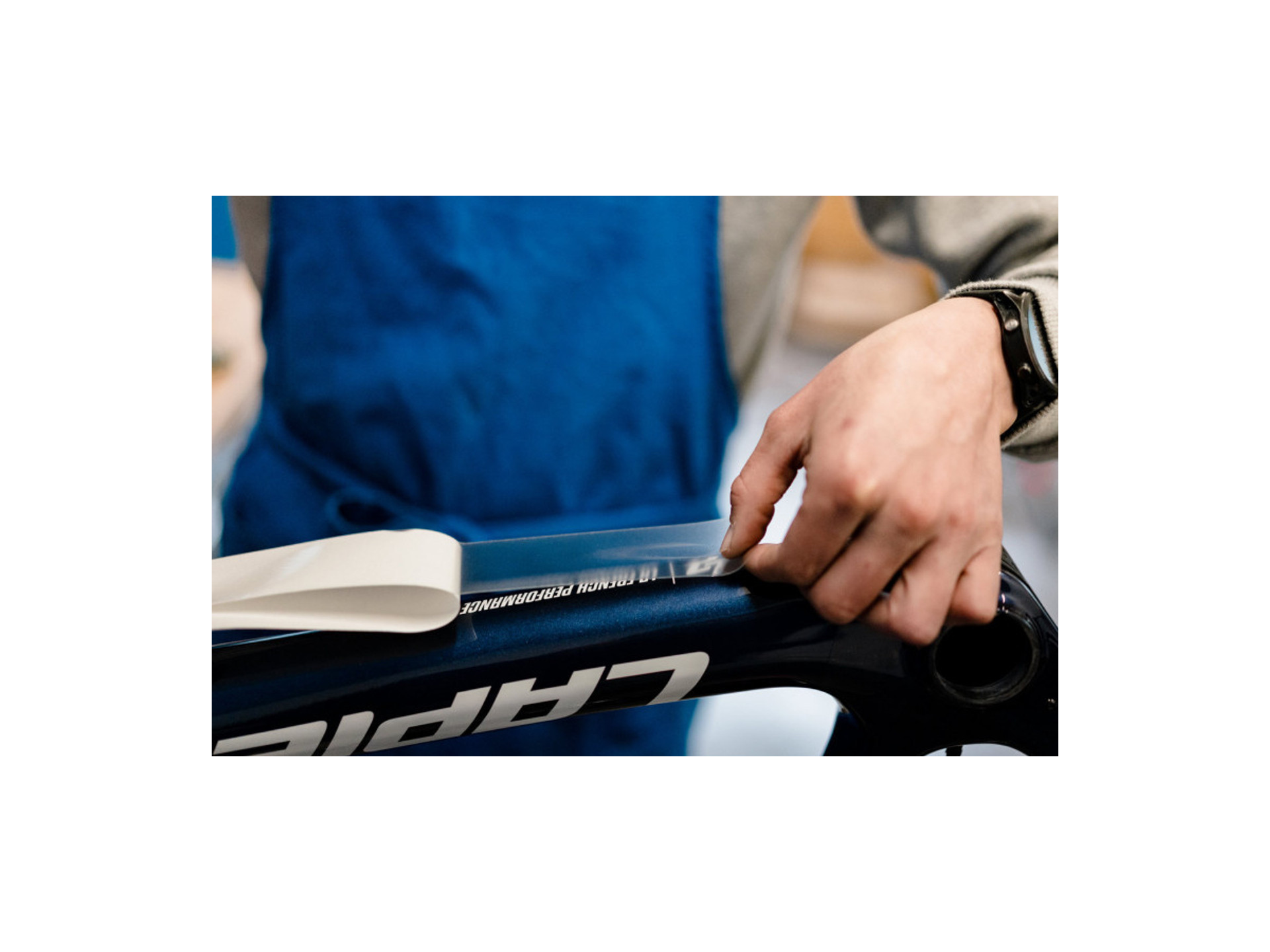Folien är tillverkad av robust polyuretan med en tjocklek på cirka 2,5 mm, vilket gör den både tålig och flexibel. Med Glue Shield-teknologin är installationen enkel och självhäftande, medan den transparenta designen bevarar cykelns utseende.